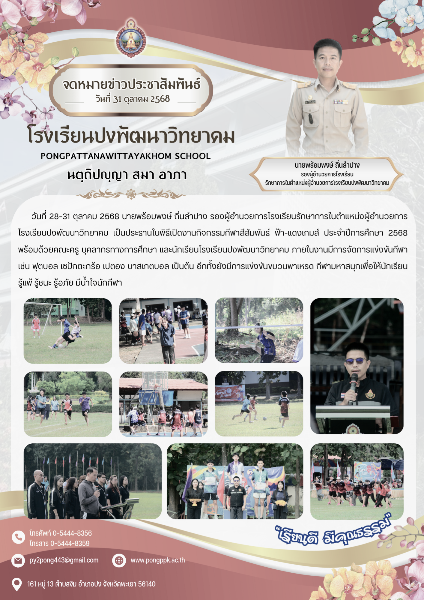 ประกาศโรงเรียนปงพัฒนาวิทยาคม เลื่อนการสอบคัดเลือกนักเรียนเข้าศึกษาในระดับชั้นมัธยมศึกษาปีที่ 1 และมัธยมศึกษาปีที่ 4 ปีการศึกษา 2568