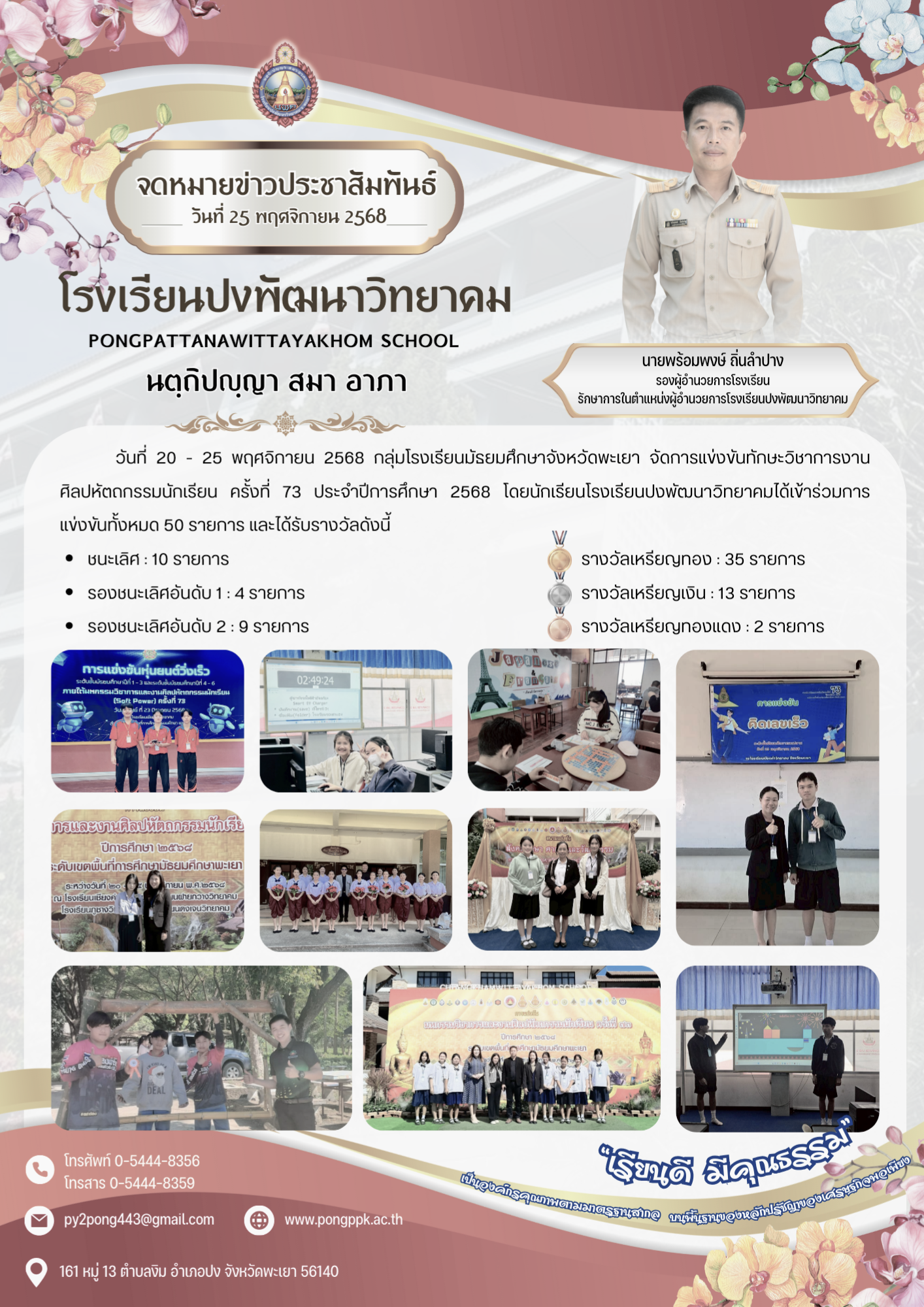 ประกาศโรงเรียนปงพัฒนาวิทยาคม เลื่อนการสอบคัดเลือกนักเรียนเข้าศึกษาในระดับชั้นมัธยมศึกษาปีที่ 1 และมัธยมศึกษาปีที่ 4 ปีการศึกษา 2568