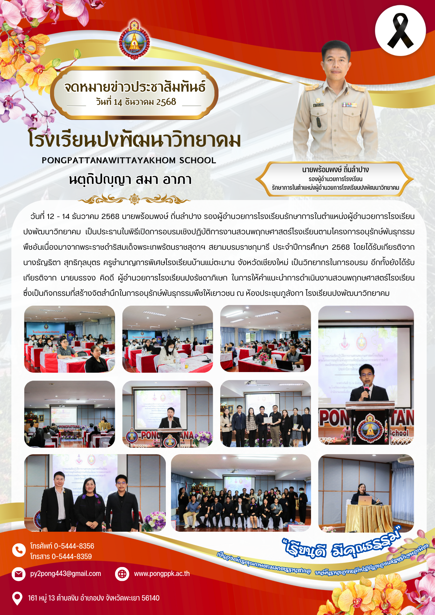 โรงเรียนปงพัฒนาวิทยาคม ได้มีภาระงานและกิจกรรมสำคัญที่ต้องดำเนินการขับเคลื่อน ซึ่งส่งผลให้มีความจำเป็นต้องหยุดการเรียนการสอนกรณีพิเศษ (เพิ่มเติม) จำนวน 2 วัน ประกอบด้วย วันที่ 12 ธันวาคม 2568 และวันที่ 24 ธันวาคม 2568 เพื่อร่วมกันขับเคลื่อนและดำเนินกิจกรรมต่างๆ ให้สำเร็จลุล่วงตามเป้าหมายที่กำหนดไว้ต่อไป