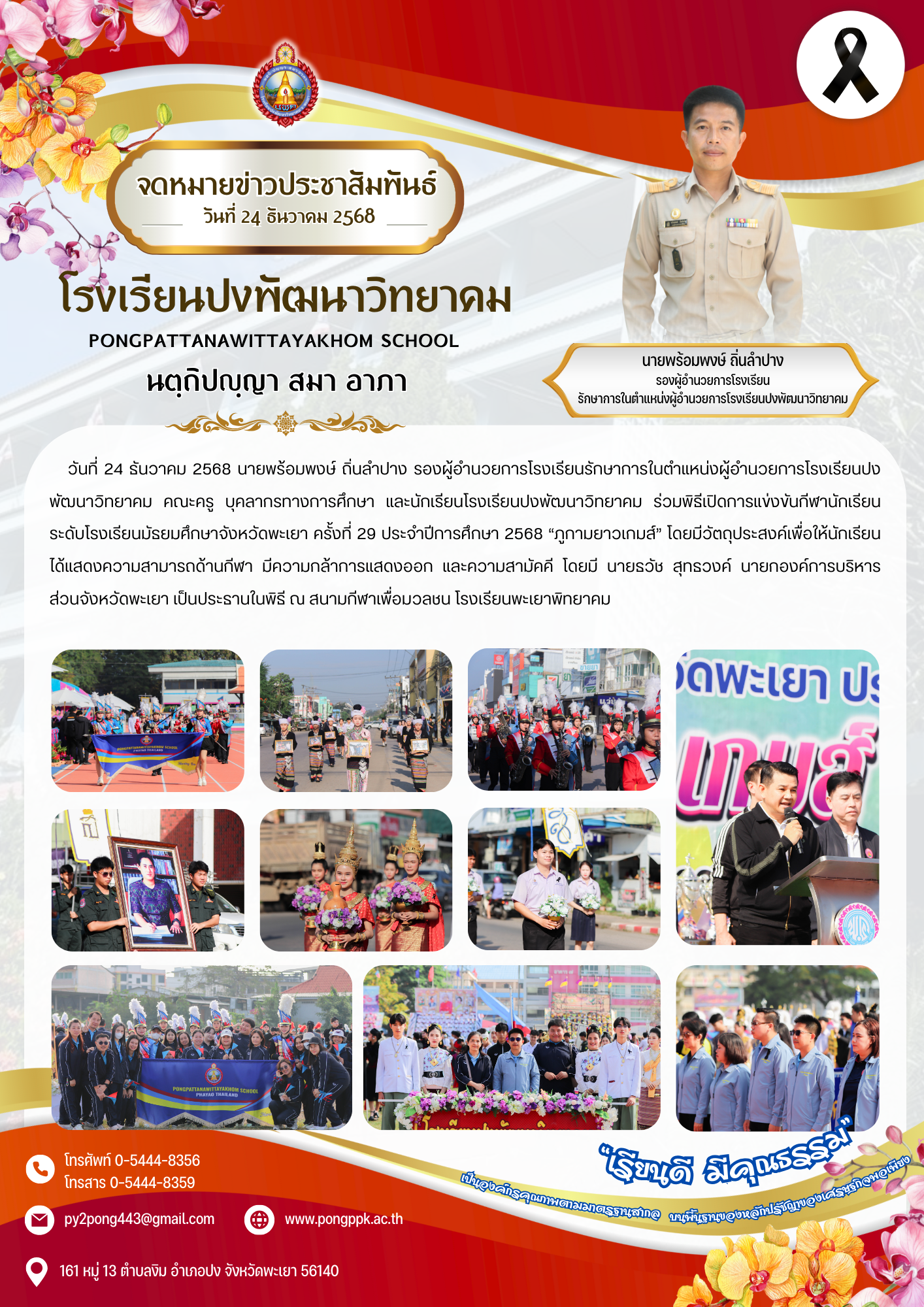 โรงเรียนปงพัฒนาวิทยาคมเข้าร่วมกีฬานักเรียนระดับโรงเรียนมัธยมศึกษาจังหวัดพะเยา ครั้งที่ 29 ประจำปีการศึกษา 2568 “ภูกามยาวเกมส์”